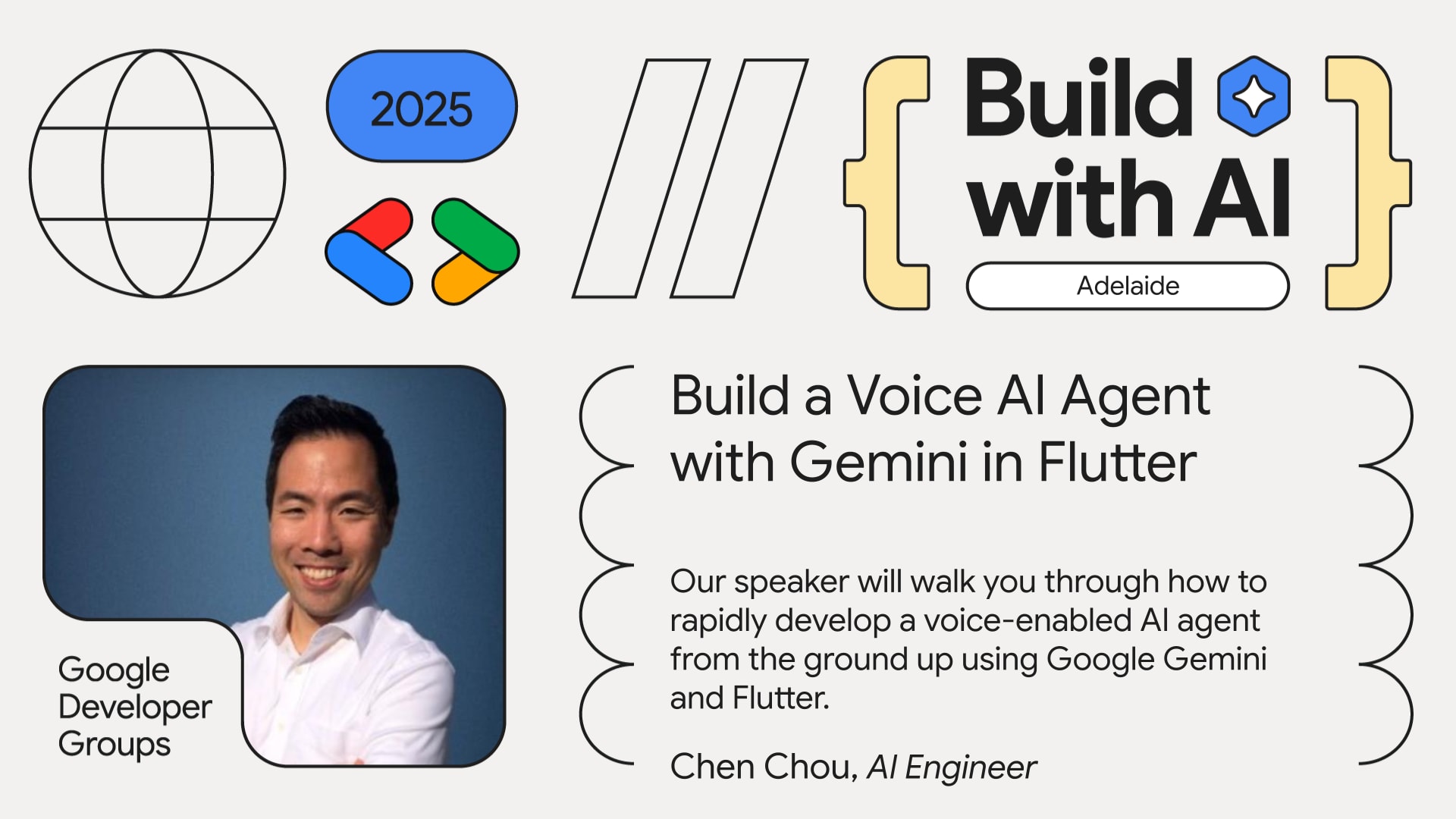 Join GDG Adelaide for Build with AI 2025 โ an evening of innovation, community, and hands-on learning. Discover how inclusive storytelling is shaping AI with Onnie Chan, and get practical skills building a voice AI agent using Gemini and Flutter with Chen Chou. Whether you're a developer or a creative technologist, this event is your gateway to the future of AI. ๐ July 17 | ๐ 5:15โ7:30 PM