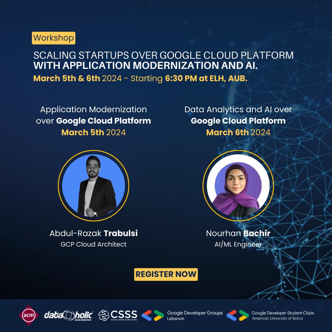 We are excited to invite you to our two-day workshop on "Scaling Startups over Google Cloud Platform with Application Modernization and AI" organized in collaboration with Google Premier Partner Dataholic, Google Developer Student Club (GDSC) - AUB, and student clubs from AUB: ACM & CSSS on March 5th & 6th, Starting 6:30 PM