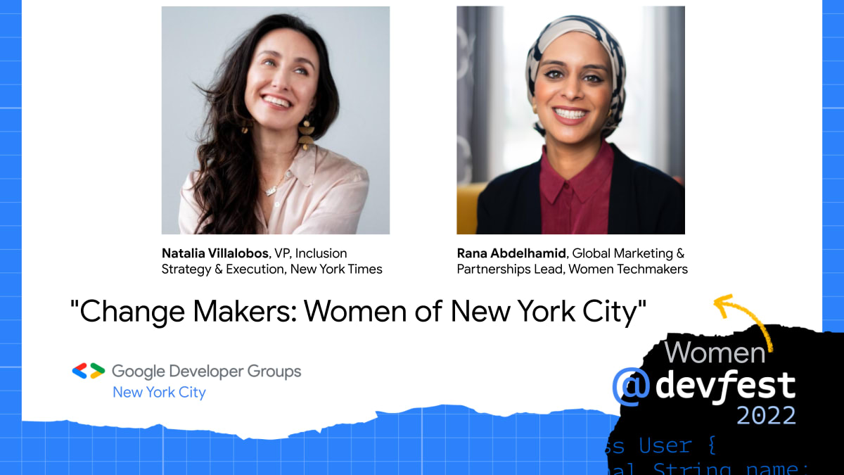 7:00 pm New! "Change Makers: Women of New York City" with Natalia Villalobos, VP, Inclusion Strategy & Execution at The New York Times and Rana Abdelhamid, Global Marketing and Partnerships Lead at Women Techmakers, Founder and Executive Director at MALIKAH - an inspirational talk about women in tech taking on big challenges. The OG Women Techmakers team will discuss running for Congress and taking on a VP role at The New York Times.