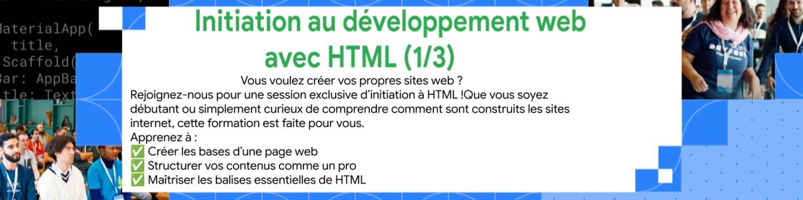🧑💻 INITIATION À HTML Vous voulez créer vos propres sites web ? Rejoignez-nous pour une session exclusive d’initiation à HTML ! Que vous soyez débutant ou simplement curieux de comprendre comment sont construits les sites internet, cette formation est faite pour vous. Apprenez à : ✅ Créer les bases d’une page web ✅ Structurer vos contenus comme un pro ✅ Maîtriser les balises essentielles de HT