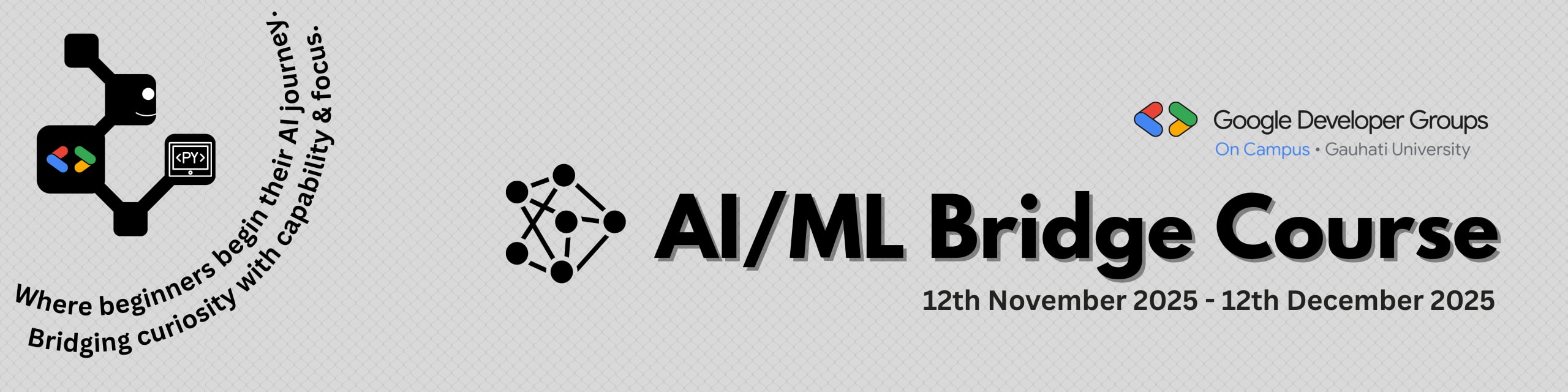 Join us at Google Developer Groups (On Campus) – Gauhati University for the launch of our AI/ML Bridge Course, a 1-month program specifically crafted for beginners eager to dive into Artificial Intelligence and Machine Learning. This course is ideal for those with little to no coding experience, aiming to build a solid foundation in AI/ML by learning Python basics, key data science libraries, and core Machine Learning principles through approachable hands-on exercises.