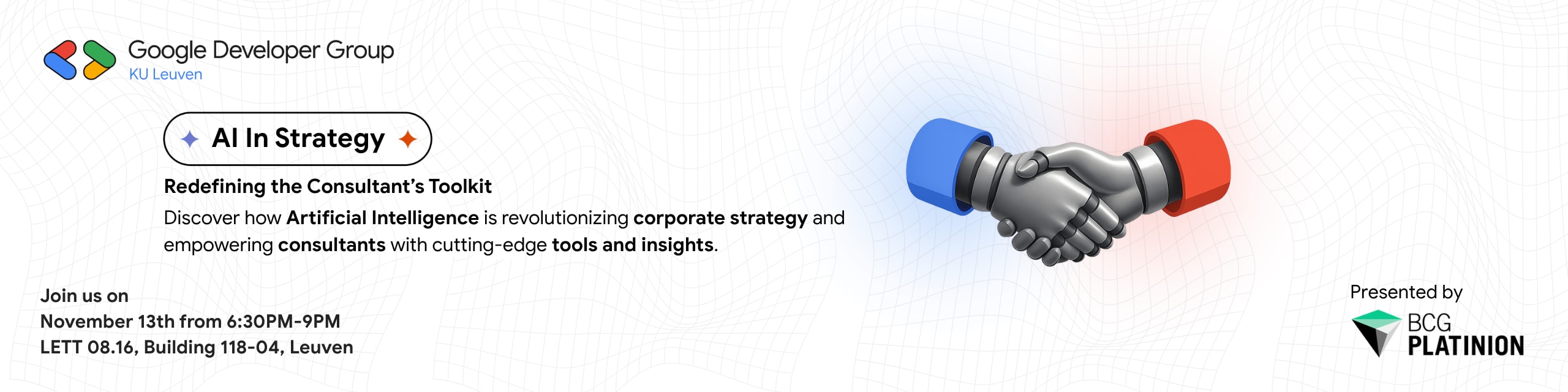 Join GDG KU Leuven x KCC for an engaging discussion on how AI, automation and cloud technologies are transforming the consulting industry. Leading experts will share real-world insights on how consultants use AI to solve strategic challenges and what skills the next generation of professionals will need to thrive.