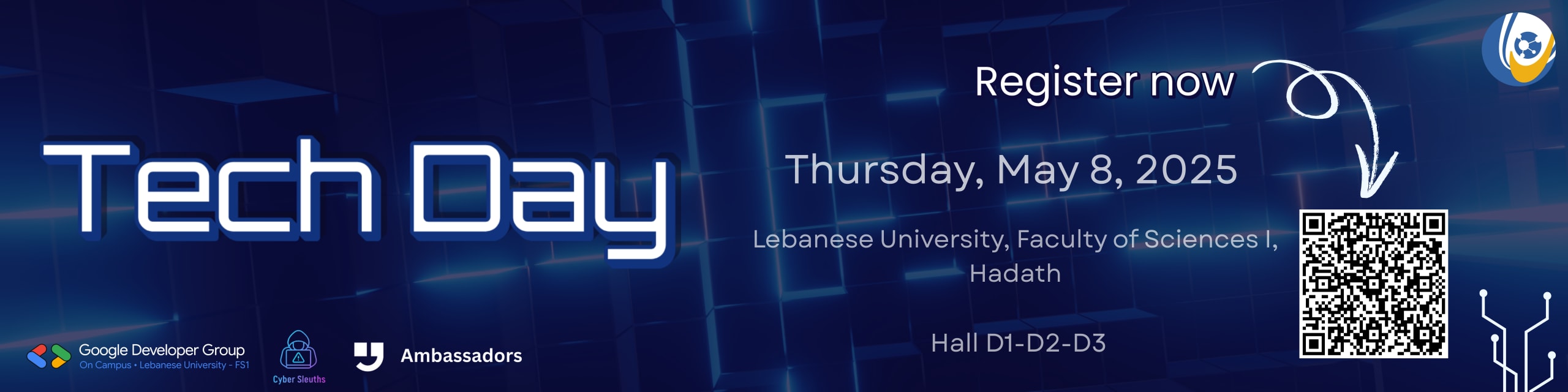 Under the sponsorship of the Department of Applied Mathematics at the Lebanese University, Faculty of Sciences I, GDG on Campus Lebanese University - FS1 & Cyber Sleuths FS1 are excited to announce Tech Day! ⭐