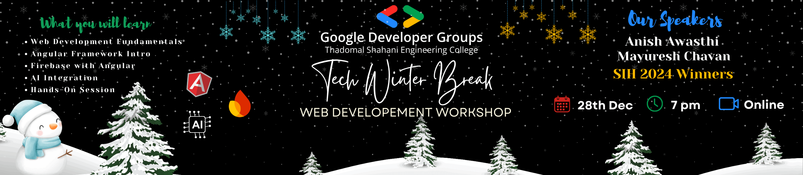 π Join us for the "Tech Winter Break Workshop" by GDG TSEC! π π Date: 28th Dec 2024 | π Time: 7:00 PM - 9:00 PM π Mode: Online | π Domain: Web Development π» Tech Stack: Angular, Firebase, Gemini 2.0 API Integration Dive into web development and AI integration π€ with SIH winners Anish Awasthi & Mayuresh Chavan. Upskill this winter π!