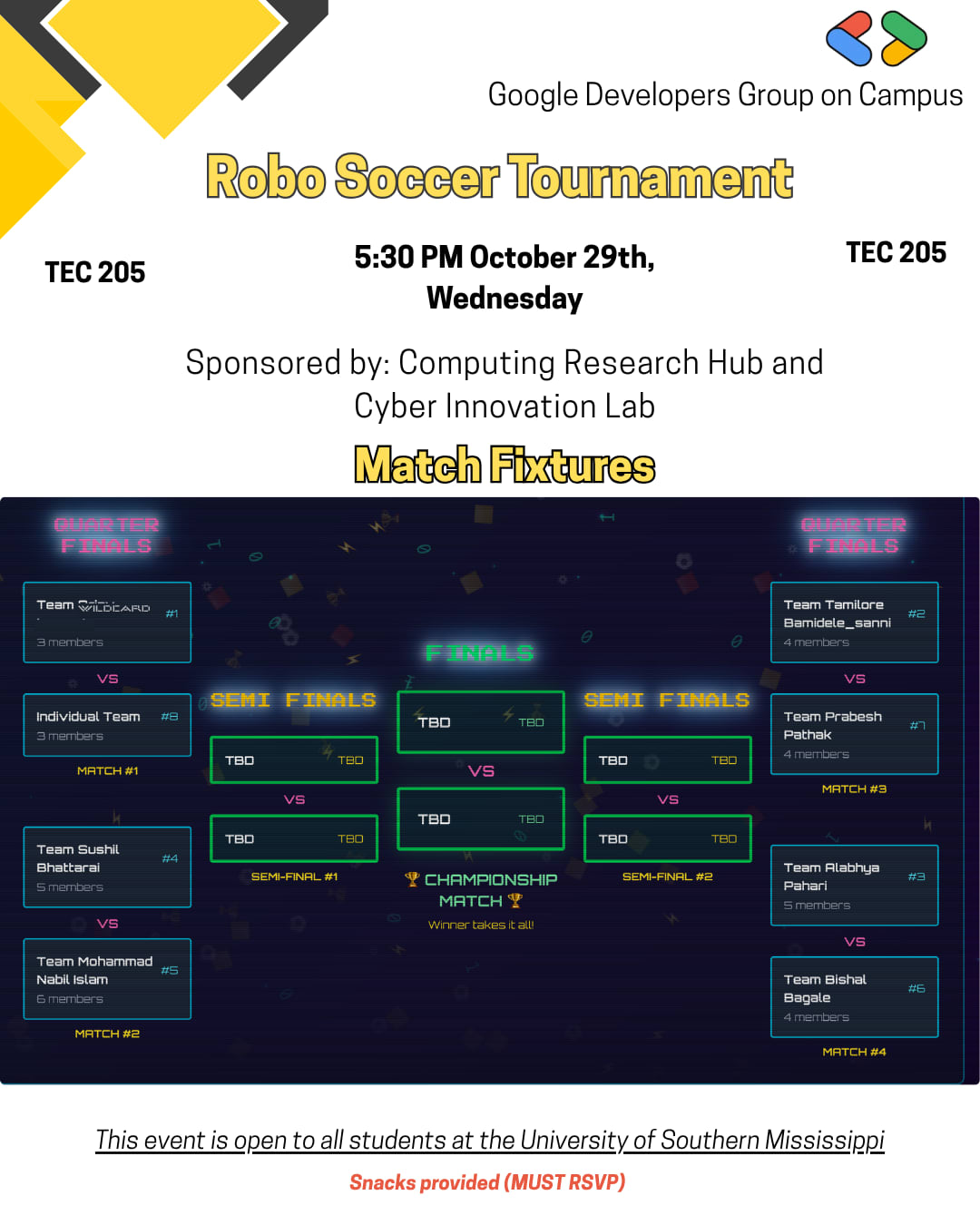 Join us for the inaugural Robo Soccer Tournament 2025, proudly presented by the GDG Chapter at the University of Southern Mississippi, in collaboration with the Cyber Innovation Lab and the School of Computing. This exciting event invites undergraduate students to unleash their creativity and technical skills by designing, building, and programming autonomous robots to compete in thrilling matches of miniature soccer. Mark your calendars for October 29th at the TEC and be part of this groundbreaking event. Connect with fellow tech enthusiasts, cheer on your favorite teams, and be amazed by the innovative designs on display. Don't miss out on this unique opportunity to experience the future of robotics in action. Come and support your peers on this exhilarating journey! Contact Ashim Dahal at Ashim.Dahal@usm.edu for more details. Let's kick-start this exciting tradition together!