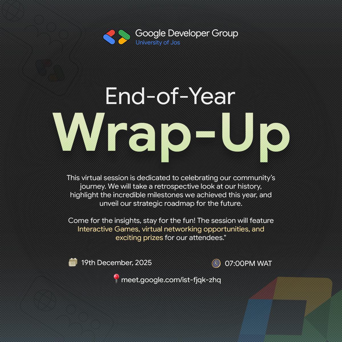 Join us for the GDG on Campus End-of-Year Wrap-Up! This virtual session is dedicated to celebrating our community’s journey. We will take a retrospective look at our history, highlight the incredible milestones we achieved this year, and unveil our strategic roadmap for the future. Come for the insights, stay for the fun! The session will feature interactive games, virtual networking opportunities, and exciting prizes for our attendees.