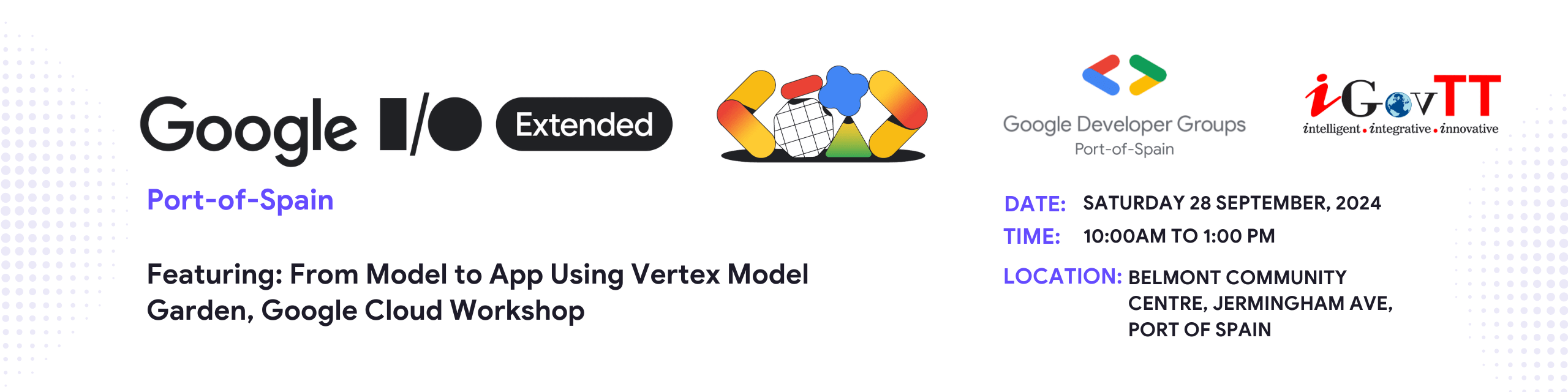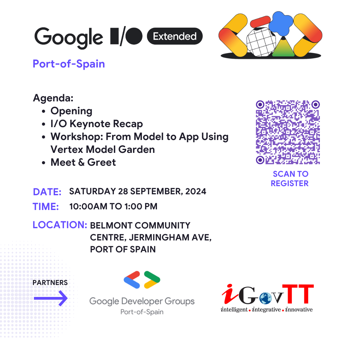Join Google Developers Group of Port of Spain and IGovTT for I/O Extended 2024 where we'll recap some of the latest in AI and Google Products! RSVP today for a spot in our Google Cloud training workshop!
