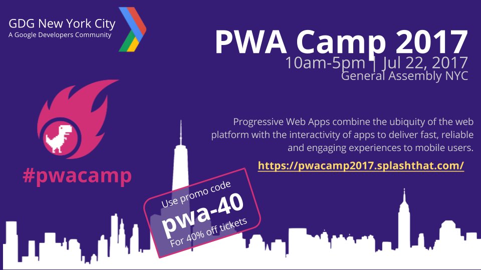 **TICKETS: https://generalassemb.ly/education/progressive-web-apps-camp/new-york-city/39343** **PROMO CODE: "pwa-40" **gets you the lowest discount (40% off) for the event. https://pbs.twimg.com/media/DEtz7IqXYAAjd0P.jpg:large **AGENDA:** Join us for this 1-day immersive learning "Study Camp" event where you will go from learning **Principles**(core concepts & tools) to **Programming** (hands-
