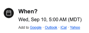 Hey Dale! Sorry about that... the event is from 5pm till 6pm on the 10th. It should be fixed now and an updated email should have gone out