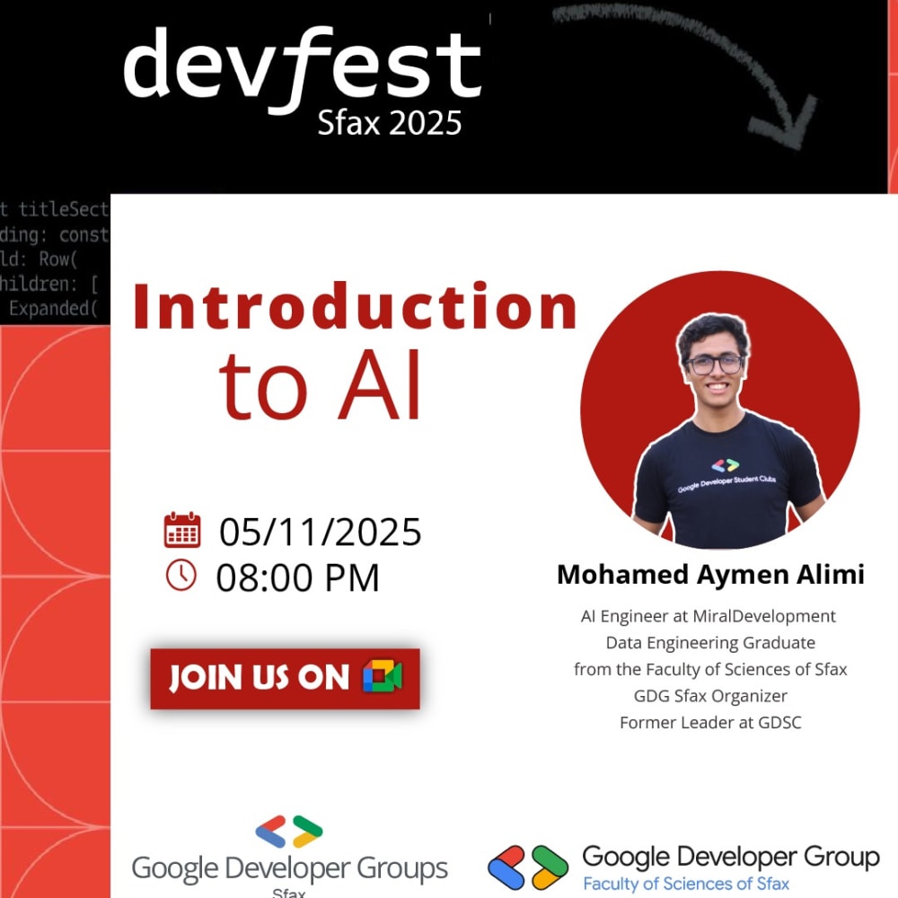Disclaimer: GDG Sfax is an independent group; our activities and the opinions expressed here should in no way be linked to Google, the corporation. To learn more about the GDG program, visit https://developers.google.com/community/gdg/
